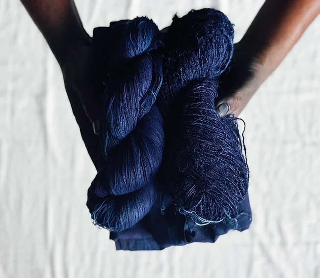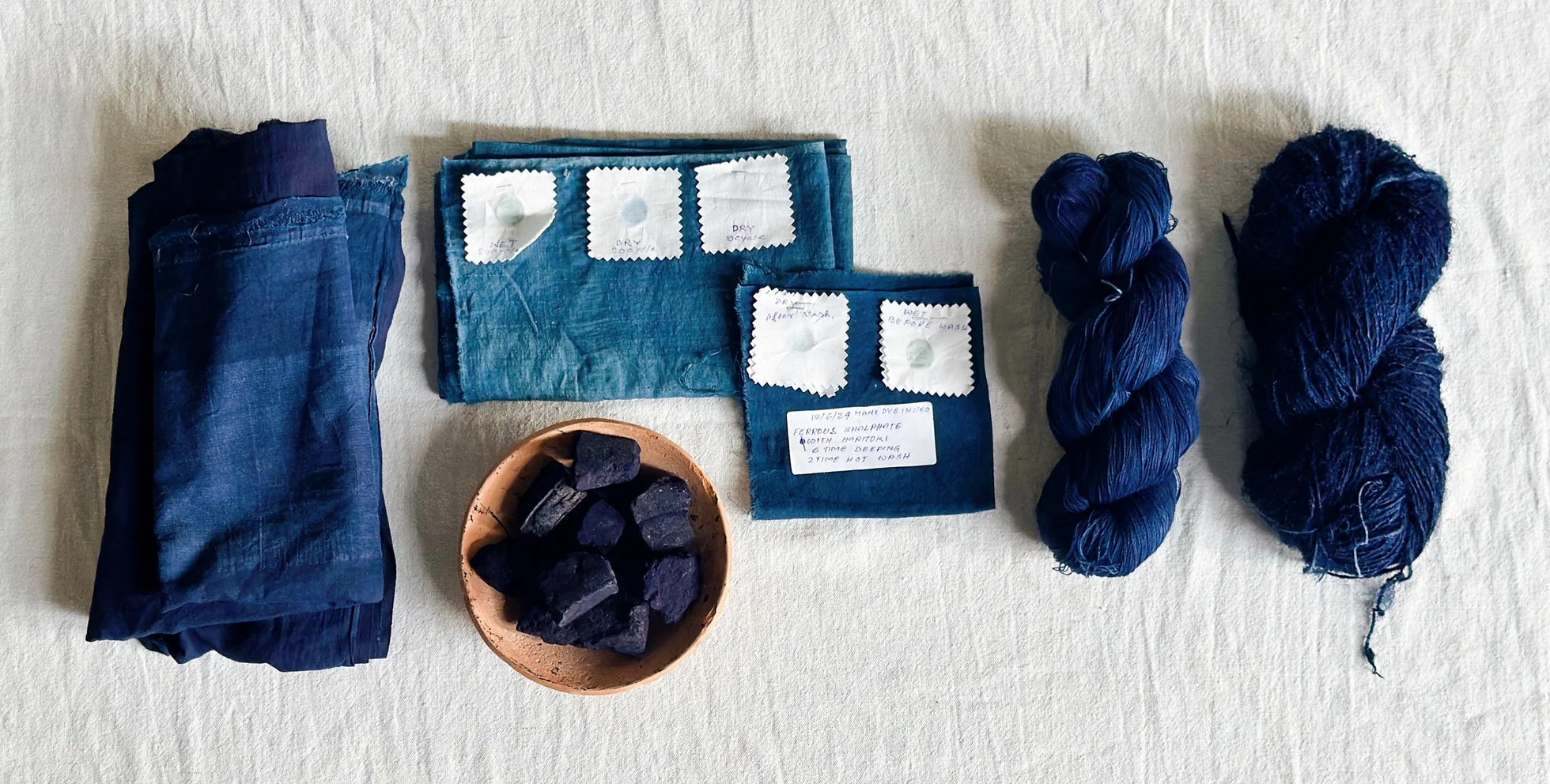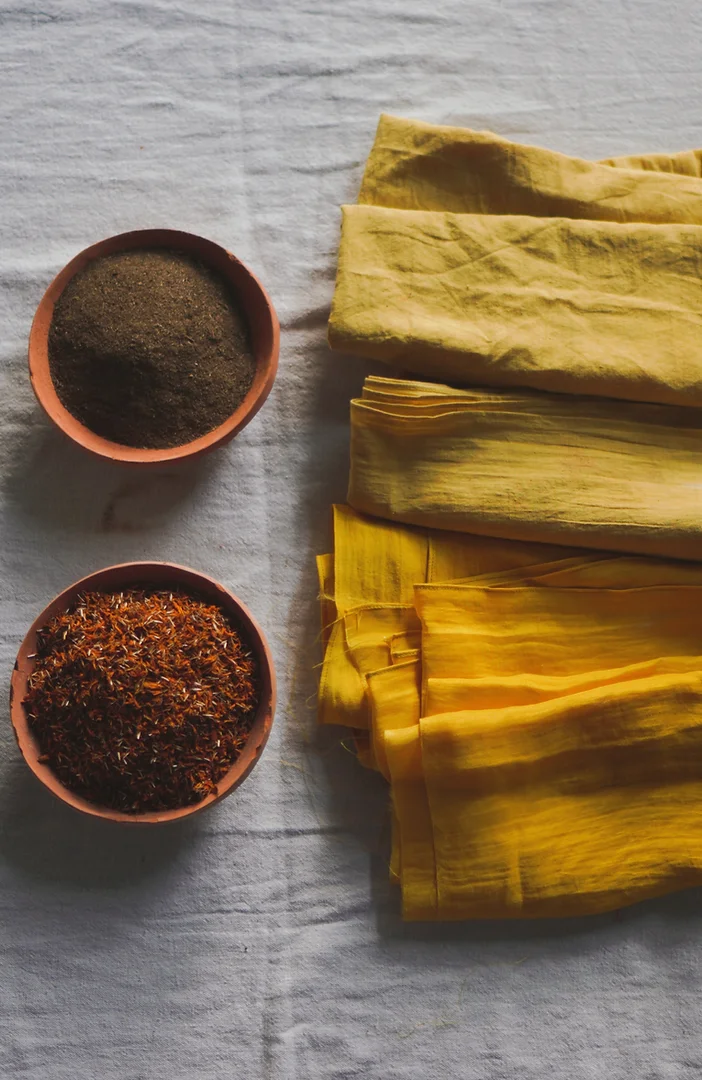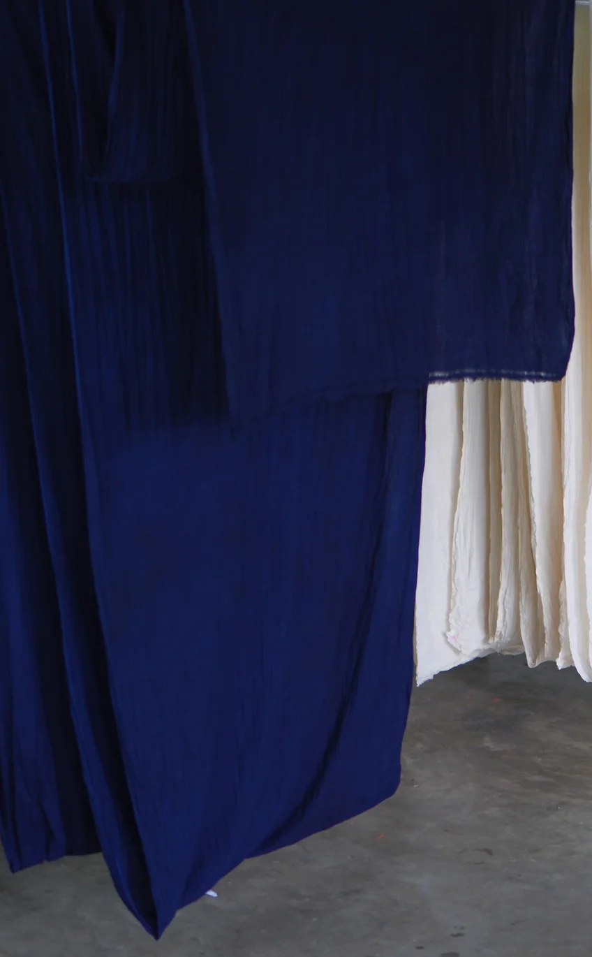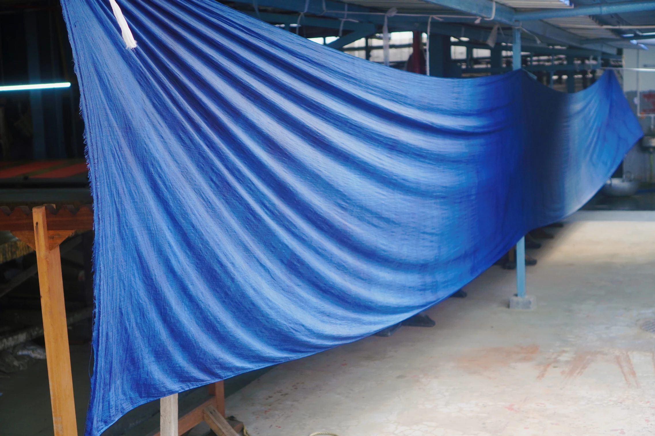 Indigo is one of the most ancient dyes in history. Indian Indigo leaves from Indigofera tinctoria plant are fermented in water with ferrous sulfate, tamarind or Cassia tora seeds with the help of lime. The process is time-taking and is accomplished with care and gentleness.